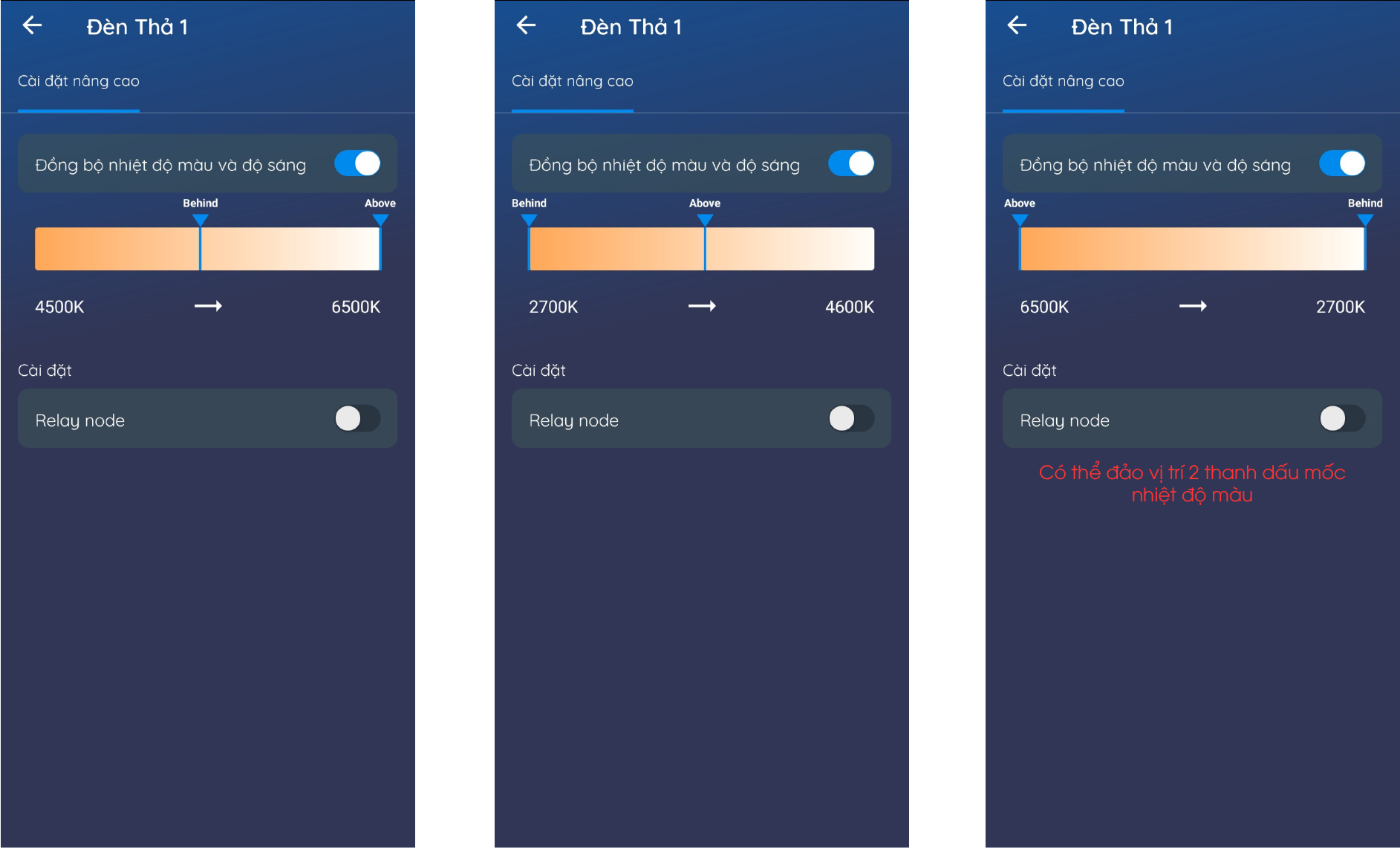 Người dùng có thể thay đổi vị trí của 2 thanh dấu mốc nhiệt độ màu, lúc này khi sử dụng cảm biến tiệm cận để tăng/giảm độ sáng đèn thì nhiệt độ mầu cũng thay đổi trong dải màu đã cài đặt.